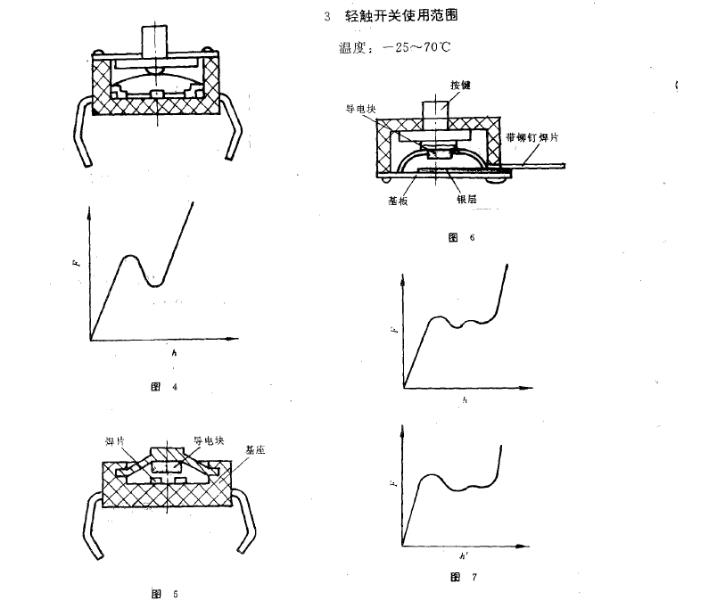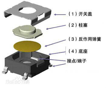 輕觸開關由:嵌件、基座、彈片、按鈕、蓋板組成其中防水類輕觸開關在彈片上加一層聚酰亞胺薄膜。