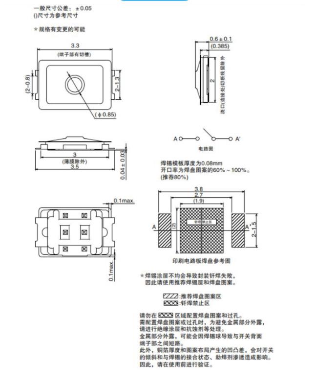 產(chǎn)品簡(jiǎn)介:型號(hào):2*3*0.6輕觸開關(guān) 操作力度:160gf/240gf/330gf 壽命:≥30萬(wàn)
