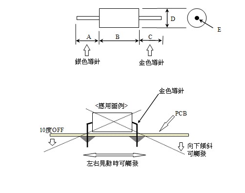 2、產(chǎn)品當(dāng)向?qū)щ姸耍ㄣy色引腳端A)傾斜、傾斜角大于15度時(shí),為開(kāi)路OFF狀態(tài),當(dāng)產(chǎn)品水平狀態(tài)發(fā)生傾斜改變,觸發(fā)端(鍍金引腳端C)低于水平傾斜角大于于15度角時(shí),為閉路ON狀態(tài)。水平放置時(shí),晃動(dòng)可易觸發(fā)。而銀色腳向下時(shí),晃動(dòng)不易觸發(fā)。